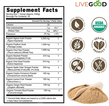 Por eso creamos LiveGood Organic Fiber , una poderosa fórmula diaria que contiene 10 de las fuentes de fibra vegetal más efectivas del planeta y que aporta 8 gramos de fibra por porción para ayudar a que tu cuerpo prospere.