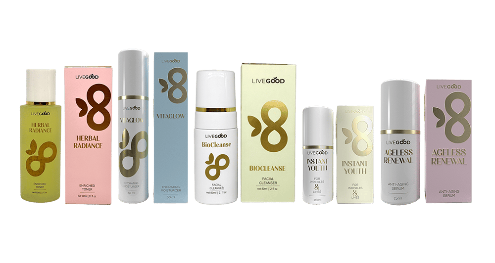 El paquete de cuidado de la piel de LiveGood incluye TODOS nuestros 5 productos para el cuidado de la piel limpios y de la más alta calidad.